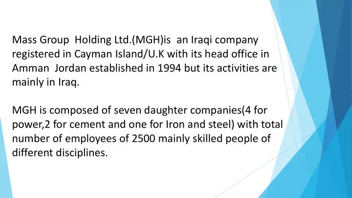 Mass Group Holding Ltd.(MGH)is an Iraqi company registered in Cayman Island/U.K with its head office in Amman Jordan established in 1994 but its activities are mainly in Iraq. MGH is composed of seven daughter companies(4 for power,2 for cement and one for Iron and steel) with total number of employees of 2500 mainly skilled people of different disciplines.