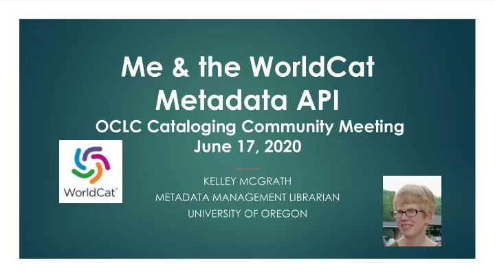 Me & the WorldCat Metadata API OCLC Cataloging Community Meeting June 17, 2020 KELLEY MCGRATH METADATA MANAGEMENT LIBRARIAN UNIVERSITY OF OREGON