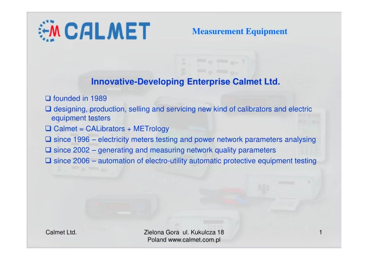 Measurement Equipment Innovative-Developing Enterprise Calmet Ltd. � founded in 1989 � designing, production, selling and servicing new kind of calibrators and electric equipment testers � Calmet = CALibrators + METrology � since 1996 – electricity meters testing and power network parameters analysing � since 2002 – generating and measuring network quality parameters � since 2006 – automation of electro-utility automatic protective equipment testing Calmet Ltd. Zielona Gora ul. Kukulcza 18 1 Poland www.calmet.com.pl