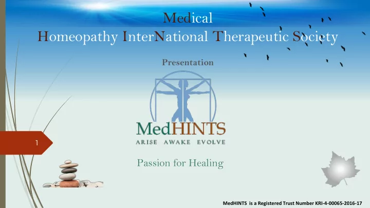 Medical Homeopathy InterNational Therapeutic Society Presentation 1 Passion for Healing MedHINTS is a Registered Trust Number KRI-4-00065-2016-17