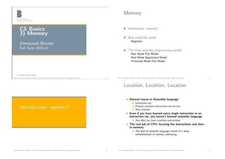 Memory CS Basics Introduction: memory? � 3) Memory Real mode flat model � Registers Emmanuel Benoist Fall Term 2016-17 The three assembly programming models � Real Mode Flat Model Real Mode Segmented Model Protected Mode Flat Model Berner Fachhochschule | Haute cole spcialise bernoise | Berne University of Applied Sciences Berner Fachhochschule | Haute cole spcialise bernoise | Berne University of Applied Sciences 1 2 Location, Location, Location Normal course in Assembly language Instruction set Introduction: memory? Present machine instructions one by one Very moronic Even if you have learned every single instruction in an instruction set, you haven’t learned assembly language Any idiot can learn machine instructions The real job of CPU: locating the instructions and data in memory The skill of assembly language consits of a deep comprehension of memory addressing Berner Fachhochschule | Haute cole spcialise bernoise | Berne University of Applied Sciences Berner Fachhochschule | Haute cole spcialise bernoise | Berne University of Applied Sciences 3 4