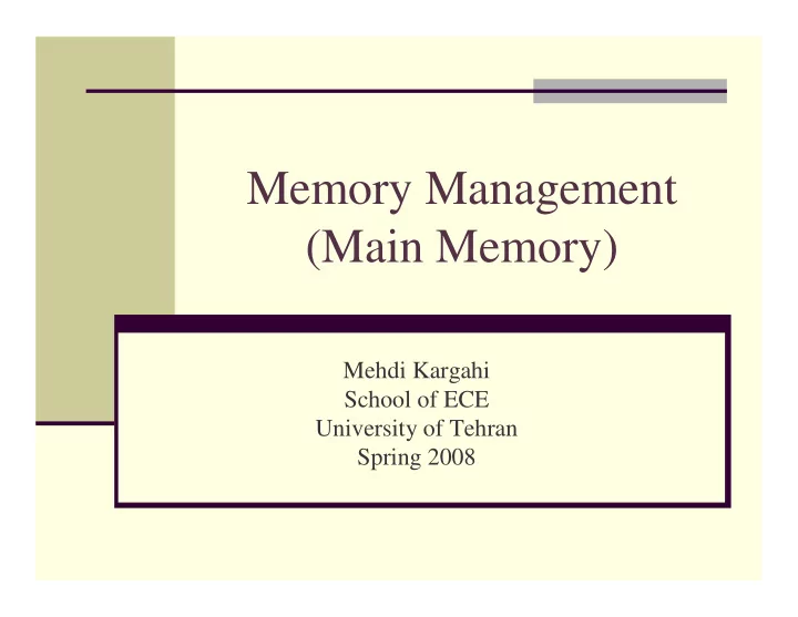 Memory Management (Main Memory) Mehdi Kargahi School of ECE University of Tehran Spring 2008