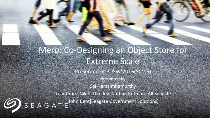 Mero: Co-Designing an Object Store for Extreme Scale Presented at PDSW’2016(SC’16) Presented by Sai Narasimhamurthy Co-authors: Nikita Danilov, Nathan Rutman [All Seagate] John Bent[Seagate Government Solutions]
