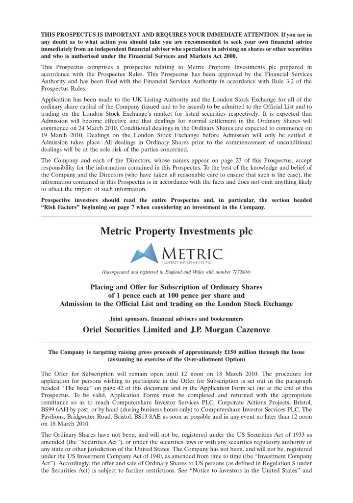 the Company’s earnings would have been to enhance earnings with the precise level being dependent on any return made on the Net Proceeds received by the Company. 7.14 NO SIGNIFICANT CHANGE As set out in Note 3 to Part 4(b) of this Prospectus: (i) on 3 March 2010, the Company’s existing Shareholders subscribed for a further 63,000 Ordinary Shares for an issue price of 100 pence per Ordinary Share; and (ii) the Company acquired a freehold reversionary interest for 30 leasehold properties comprised within one freehold title for an aggregate purchase price of £107,474; and (iii) on 8 March 2010 the Company entered into a conditional share sale agreement pursuant to which the Company agreed to acquire issued share capital (being 2 ordinary shares) of Metric Property start-up Limited for a cash consideration of £2 (conditional on Admission). The changes set out above decreased the Company’s cash to less than £6,000, increased its assets by over £60,000 and commenced the Company’s trading operations. Other than as set out above, there has been no significant change in the financial or trading position of the Company since incorporation. 7.15 LITIGATION The Company is not and has not at any time since its incorporation been, involved in any governmental, legal or arbitration proceedings, and the Company is not aware of any governmental, legal or arbitration proceedings pending or threatened by or against the Group, nor of any such proceedings having been pending or threatened at any time since its incorporation, in each case which may have, or have had in the recent past, a significant effect on the Group’s financial position or profitability. 7.16 GENERAL (a) The total costs (including fees and commissions) (exclusive of recoverable VAT) payable by the Company in connection with the Issue and Admission are estimated to amount to £5.8 million assuming gross proceeds of £150 million. The estimated net cash proceeds accruing to the Company from the Issue (on the same basis and assuming no exercise of the Over-allotment Option) are £144.2 million. (b) IPD statistics in this document have been sourced from Investment Property Databank, an independent research company with company number 1879480 and registered address 1 St John’s Lane, London EC1M 4BL, England. Where information has been sourced from British Land, except where otherwise indicated, the information has been sourced from British Land annual, half year or quarterly reports and results presentations for the periods 2004/2005 to 2009/2010 (inclusive). To the extent that information in this document has been sourced from a third party, the Company confirms that the information has been accurately reproduced and so far as the Company is aware, and is able to ascertain from information published by that party, no facts have been omitted that would render the information reproduced inaccurate or misleading. (c) Deloitte LLP of Hill House, 1 Little New Street, London EC4A 3TR, a member firm of the Institute of Chartered Accountants in England and Wales, has given and not withdrawn its written consent to the inclusion of its report included within Part 4 of this Prospectus in the form and context in which it appears. As the Ordinary Shares have not been and will not be registered under the Securities Act, Deloitte has not filed a consent under the Securities Act. (d) The Company has no subsidiaries but, as described in paragraph 7.11(a)(iii) above will acquire Metric Property Start-Up Limited conditional on Admission. (e) Save as described at paragraph 7.16(l) below, the Company has no existing interests in real property and has no tangible fixed assets which are material to its business. (f) The Directors are not aware of any environmental issues which may affect the Company’s utilisation of its tangible fixed assets (if any). (g) The financial information set out in this Prospectus relating to the Company does not constitute statutory accounts within the meaning of section 434 of the Companies Act. The Company intends to publish its first set of interim financial statements at 30 September 2010 and the first annual report of 92