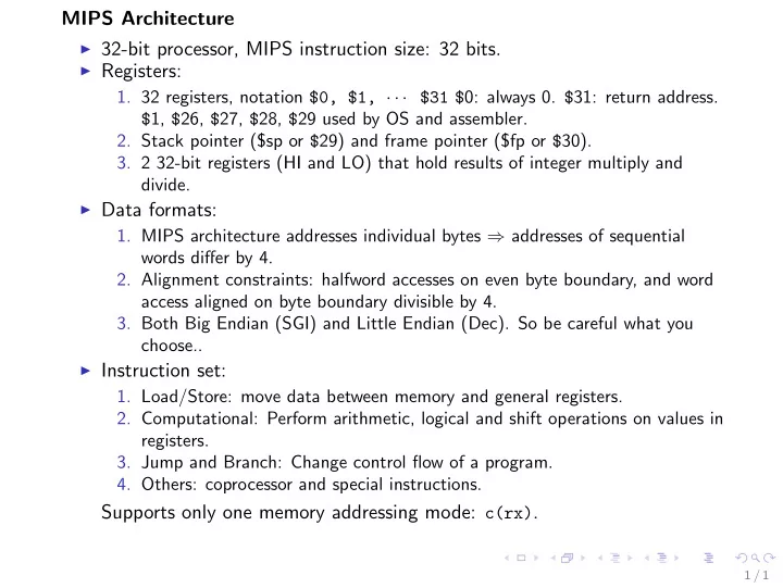 MIPS Architecture ◮ 32-bit processor, MIPS instruction size: 32 bits. ◮ Registers: 1. 32 registers, notation $0, $1, · · · $31 $ 0: always 0. $ 31: return address. $ 1, $ 26, $ 27, $ 28, $ 29 used by OS and assembler. 2. Stack pointer ($sp or $ 29) and frame pointer ($fp or $ 30). 3. 2 32-bit registers (HI and LO) that hold results of integer multiply and divide. ◮ Data formats: 1. MIPS architecture addresses individual bytes ⇒ addresses of sequential words differ by 4. 2. Alignment constraints: halfword accesses on even byte boundary, and word access aligned on byte boundary divisible by 4. 3. Both Big Endian (SGI) and Little Endian (Dec). So be careful what you choose.. ◮ Instruction set: 1. Load/Store: move data between memory and general registers. 2. Computational: Perform arithmetic, logical and shift operations on values in registers. 3. Jump and Branch: Change control flow of a program. 4. Others: coprocessor and special instructions. Supports only one memory addressing mode: c(rx) . 1 / 1
