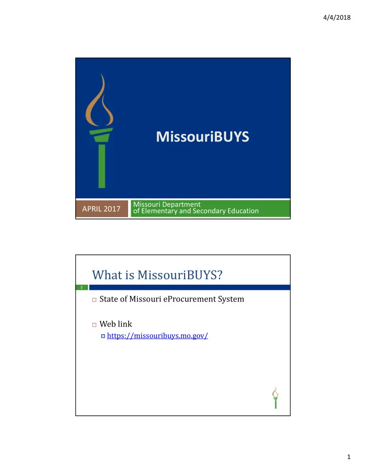 4/4/2018 MissouriBUYS Missouri Department APRIL 2017 of Elementary and Secondary Education 2 What is MissouriBUYS? State of Missouri eProcurement System Web link https://missouribuys.mo.gov/ 1