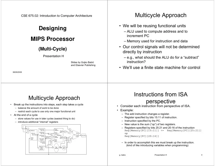 Multicycle Approach CSE 675.02: Introduction to Computer Architecture • We will be reusing functional units Designing – ALU used to compute address and to increment PC MIPS Processor – Memory used for instruction and data • Our control signals will not be determined (Multi-Cycle) directly by instruction Presentation H – e.g., what should the ALU do for a “subtract” instruction? Slides by Gojko Babi ć and Elsevier Publishing • We’ll use a finite state machine for control 08/08/2005 Instructions from ISA Multicycle Approach perspective • Break up the instructions into steps, each step takes a cycle • Consider each instruction from perspective of ISA. – balance the amount of work to be done • Example: – restrict each cycle to use only one major functional unit – The add instruction changes a register. • At the end of a cycle – Register specified by bits 15:11 of instruction. – store values for use in later cycles (easiest thing to do) – Instruction specified by the PC. – introduce additional “internal” registers – New value is the sum (“op”) of two registers. – Registers specified by bits 25:21 and 20:16 of the instruction 0 PC Read 0 Instruction M Reg[Memory[PC][15:11]] <= Reg[Memory[PC][25:21]] M u Address [25–21] register 1 Read u x A data 1 x Instruction 1 Read op Memory 1 Zero [20–16] register 2 0 MemData ALU ALU Instruction Registers M ALUOut Reg[Memory[PC][20:16]] Write result [15–0] Instruction u Read x register 0 Write [15–11] B data 2 1 Instruction 1 M data 4 u register Write 0 2 x data – In order to accomplish this we must break up the instruction. M Instruction 3 u [15–0] x (kind of like introducing variables when programming) 1 16 32 Memory Sign Shift data extend left 2 register g. babic Presentation H 4
