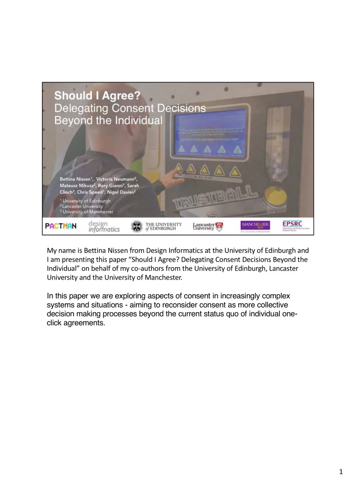 My name is Bettina Nissen from Design Informatics at the University of Edinburgh and I am presenting this paper “Should I Agree? Delegating Consent Decisions Beyond the Individual” on behalf of my co-authors from the University of Edinburgh, Lancaster University and the University of Manchester. In this paper we are exploring aspects of consent in increasingly complex systems and situations - aiming to reconsider consent as more collective decision making processes beyond the current status quo of individual one- click agreements. 1