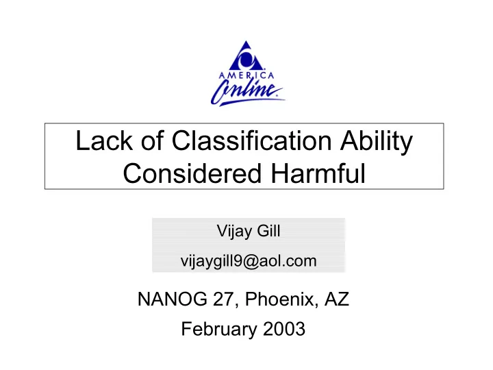 Vijay Gill vijaygill9@aol.com NANOG 27, Phoenix, AZ February 2003