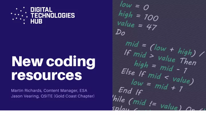 New coding resources Martin Richards, Content Manager, ESA Jason Vearing, QSITE ( Gold Coast Chapter )