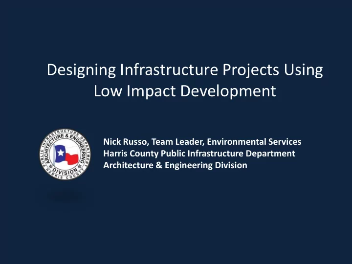 Designing Infrastructure Projects Using Low Impact Development Nick Russo, Team Leader, Environmental Services Harris County Public Infrastructure Department Architecture & Engineering Division