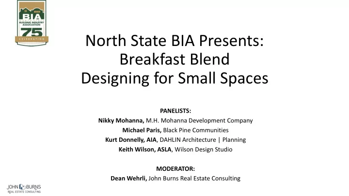 North State BIA Presents: Breakfast Blend Designing for Small Spaces PANELISTS: Nikky Mohanna, M.H. Mohanna Development Company Michael Paris, Black Pine Communities Kurt Donnelly, AIA , DAHLIN Architecture | Planning Keith Wilson, ASLA , Wilson Design Studio MODERATOR: Dean Wehrli, John Burns Real Estate Consulting