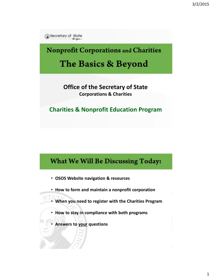 3/2/2015 Office of the Secretary of State Corporations & Charities Charities & Nonprofit Education Program • OSOS Website navigation & resources • How to form and maintain a nonprofit corporation • When you need to register with the Charities Program • How to stay in compliance with both programs • Answers to your questions 1