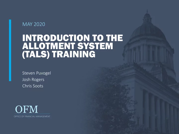 MAY 2020 INTRODUCTION TO THE ALLOTMENT SYSTEM (TALS) TRAINING Steven Puvogel Josh Rogers Chris Soots OFM OFFICE OF FINANCIAL MANAGEMENT