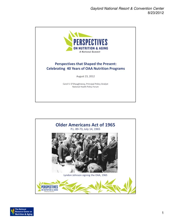 Gaylord National Resort & Convention Center 8/23/2012 Perspectives that Shaped the Present: Celebrating 40 Years of OAA Nutrition Programs August 23, 2012 Carol V. O’Shaughnessy, Principal Policy Analyst National Health Policy Forum Older Americans Act of 1965 P.L. 89-73, July 14, 1965 Lyndon Johnson signing the OAA, 1965 1