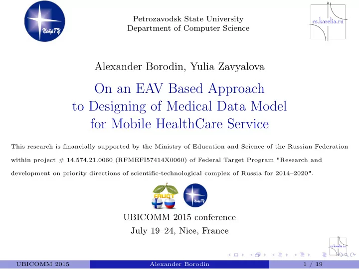 Petrozavodsk State University Department of Computer Science Alexander Borodin, Yulia Zavyalova On an EAV Based Approach to Designing of Medical Data Model for Mobile HealthCare Service This research is financially supported by the Ministry of Education and Science of the Russian Federation within project # 14.574.21.0060 (RFMEFI57414X0060) of Federal Target Program "Research and development on priority directions of scientific-technological complex of Russia for 2014–2020". UBICOMM 2015 conference July 19–24, Nice, France UBICOMM 2015 Alexander Borodin 1 / 19
