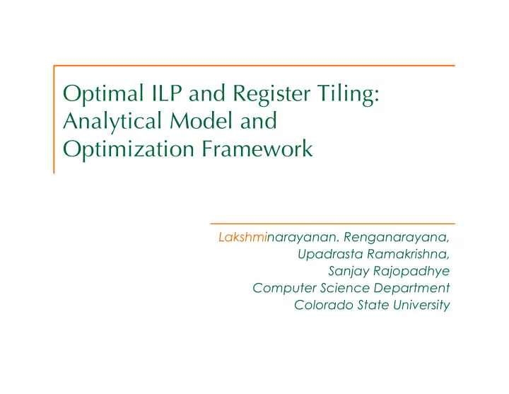 Optimal ILP and Register Tiling: Analytical Model and Optimization Framework Lakshminarayanan. Renganarayana, Upadrasta Ramakrishna, Sanjay Rajopadhye Computer Science Department Colorado State University