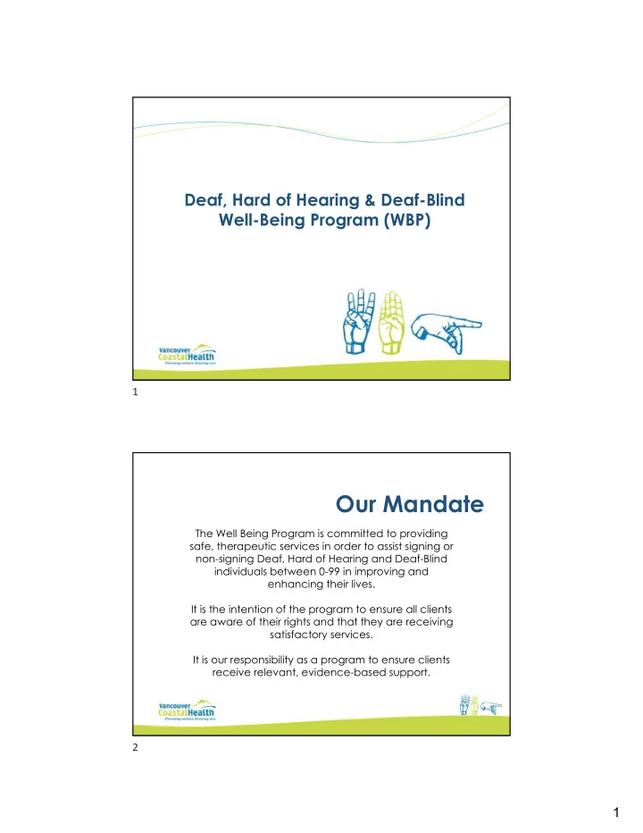 Deaf, Hard of Hearing & Deaf-Blind Well-Being Program (WBP) 1 Our Mandate The Well Being Program is committed to providing safe, therapeutic services in order to assist signing or non-signing Deaf, Hard of Hearing and Deaf-Blind individuals between 0-99 in improving and enhancing their lives. It is the intention of the program to ensure all clients are aware of their rights and that they are receiving satisfactory services. It is our responsibility as a program to ensure clients receive relevant, evidence-based support. 2 1