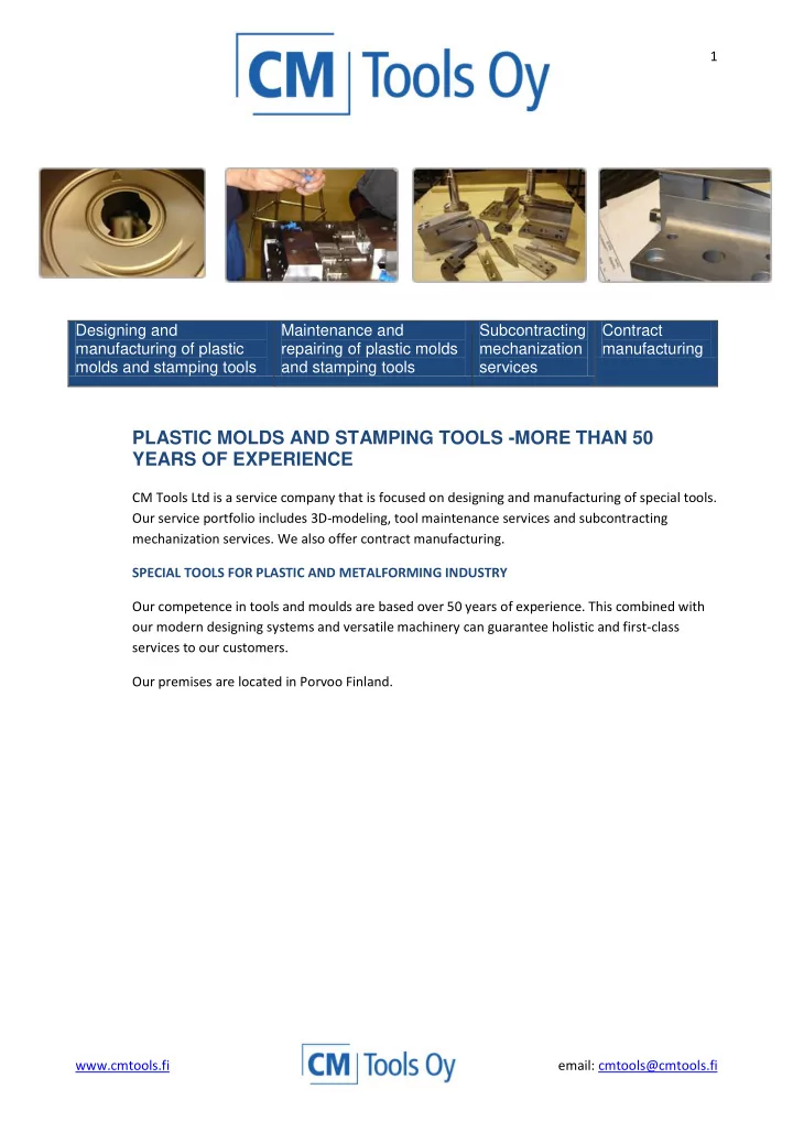 1 Designing and Maintenance and Subcontracting Contract manufacturing of plastic repairing of plastic molds mechanization manufacturing molds and stamping tools and stamping tools services PLASTIC MOLDS AND STAMPING TOOLS -MORE THAN 50 YEARS OF EXPERIENCE CM Tools Ltd is a service company that is focused on designing and manufacturing of special tools. Our service portfolio includes 3D-modeling, tool maintenance services and subcontracting mechanization services. We also offer contract manufacturing. SPECIAL TOOLS FOR PLASTIC AND METALFORMING INDUSTRY Our competence in tools and moulds are based over 50 years of experience. This combined with our modern designing systems and versatile machinery can guarantee holistic and first-class services to our customers. Our premises are located in Porvoo Finland. www.cmtools.fi email: cmtools@cmtools.fi