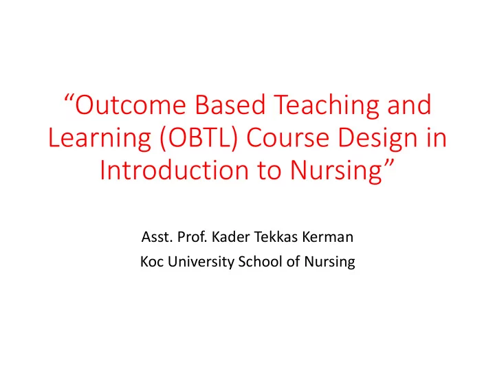 “Outcome Based Teaching and Learning (OBTL) Course Design in Introduction to Nursing” Asst. Prof. Kader Tekkas Kerman Koc University School of Nursing
