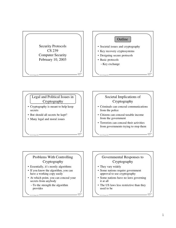 Outline Security Protocols • Societal issues and cryptography CS 239 • Key recovery cryptosystems Computer Security • Designing secure protocols February 10, 2003 • Basic protocols –Key exchange Lecture 8 Lecture 8 Page 1 Page 2 CS 239, Winter 2003 CS 239, Winter 2003 Legal and Political Issues in Societal Implications of Cryptography Cryptography • Cryptography is meant to help keep • Criminals can conceal communications secrets from the police • But should all secrets be kept? • Citizens can conceal taxable income from the government • Many legal and moral issues • Terrorists can conceal their activities from governments trying to stop them Lecture 8 Lecture 8 Page 3 Page 4 CS 239, Winter 2003 CS 239, Winter 2003 Problems With Controlling Governmental Responses to Cryptography Cryptography • Essentially, it’s mostly algorithms • They vary widely • If you know the algorithm, you can • Some nations require government have a working copy easily approval to use cryptography • At which point, you can conceal your • Some nations have no laws governing secrets from anybody it at all –To the strength the algorithm • The US laws less restrictive than they provides used to be Lecture 8 Lecture 8 Page 5 Page 6 CS 239, Winter 2003 CS 239, Winter 2003 1