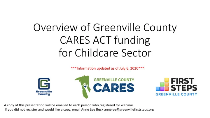 Overview of Greenville County CARES ACT funding for Childcare Sector ***Information updated as of July 6, 2020*** A copy of this presentation will be emailed to each person who registered for webinar. If you did not register and would like a copy, email Anne Lee Buck annelee@greenvillefirststeps.org