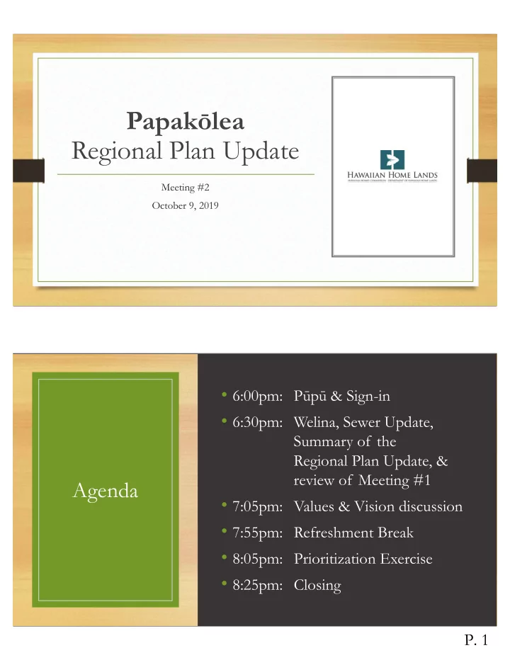 Papak � lea Regional Plan Update Meeting #2 October 9, 2019 • 6:00pm: P � p � & Sign-in • 6:30pm: Welina, Sewer Update, Summary of the Regional Plan Update, & review of Meeting #1 Agenda • 7:05pm: Values & Vision discussion • 7:55pm: Refreshment Break • 8:05pm: Prioritization Exercise • 8:25pm: Closing P. 1