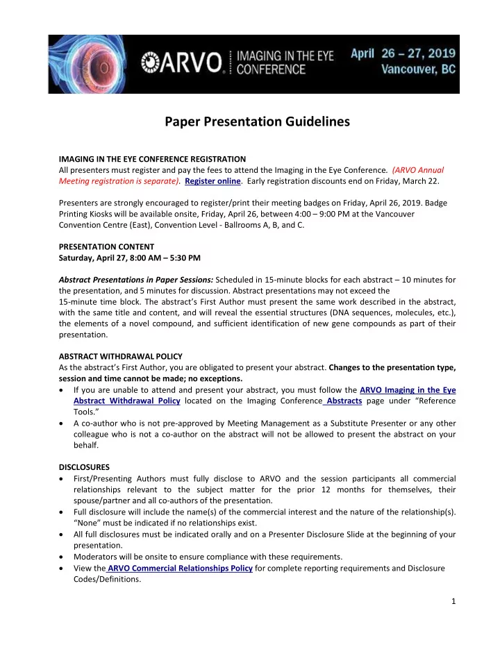Paper Presentation Guidelines IMAGING IN THE EYE CONFERENCE REGISTRATION All presenters must register and pay the fees to attend the Imaging in the Eye Conference . (ARVO Annual Meeting registration is separate) . Register online . Early registration discounts end on Friday, March 22. Presenters are strongly encouraged to register/print their meeting badges on Friday, April 26, 2019. Badge Printing Kiosks will be available onsite, Friday, April 26, between 4:00 – 9:00 PM at the Vancouver Convention Centre (East), Convention Level - Ballrooms A, B, and C. PRESENTATION CONTENT Saturday, April 27, 8:00 AM – 5:30 PM Abstract Presentations in Paper Sessions: Scheduled in 15-minute blocks for each abstract – 10 minutes for the presentation, and 5 minutes for discussion. Abstract presentations may not exceed the 15-minute time block. The abstract’s First Author must present the same work described in the abstract, with the same title and content, and will reveal the essential structures (DNA sequences, molecules, etc.), the elements of a novel compound, and sufficient identification of new gene compounds as part of their presentation. ABSTRACT WITHDRAWAL POLICY As the abstract’s First Author, you are obligated to present your abstract. Changes to the presentation type, session and time cannot be made; no exceptions. • If you are unable to attend and present your abstract, you must follow the ARVO Imaging in the Eye Abstract Withdrawal Policy located on the Imaging Conference Abstracts page under “Reference Tools.” • A co-author who is not pre-approved by Meeting Management as a Substitute Presenter or any other colleague who is not a co-author on the abstract will not be allowed to present the abstract on your behalf. DISCLOSURES • First/Presenting Authors must fully disclose to ARVO and the session participants all commercial relationships relevant to the subject matter for the prior 12 months for themselves, their spouse/partner and all co-authors of the presentation. • Full disclosure will include the name(s) of the commercial interest and the nature of the relationship(s). “None” must be indicated if no relationships exist. • All full disclosures must be indicated orally and on a Presenter Disclosure Slide at the beginning of your presentation. • Moderators will be onsite to ensure compliance with these requirements. • View the ARVO Commercial Relationships Policy for complete reporting requirements and Disclosure Codes/Definitions. 1