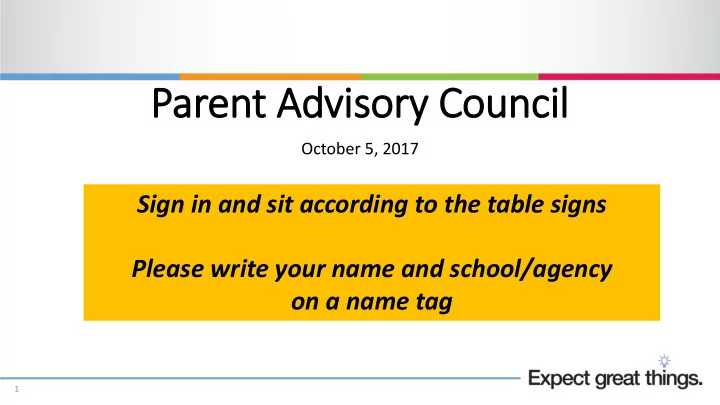 Parent Advisory ry Council October 5, 2017 Sign in and sit according to the table signs Please write your name and school/agency on a name tag 1