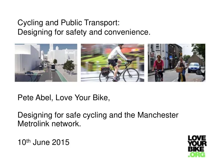 Cycling and Public Transport: Designing for safety and convenience. Pete Abel, Love Your Bike, Designing for safe cycling and the Manchester Metrolink network. 10 th June 2015