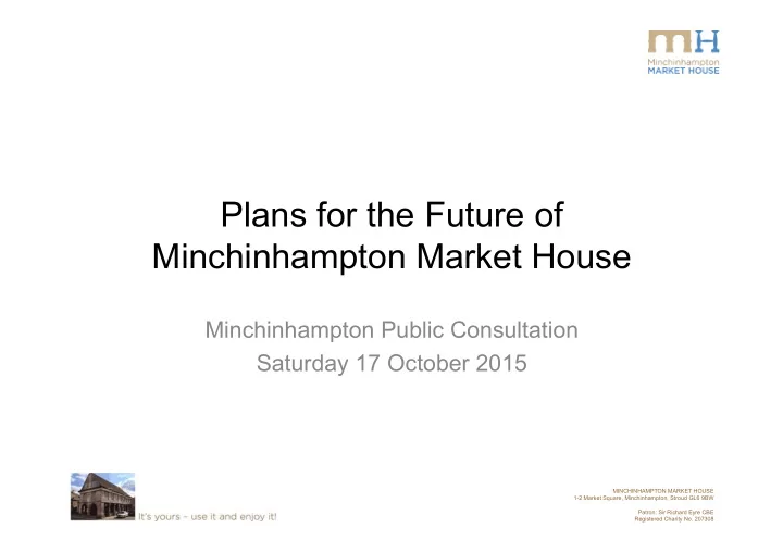 Plans for the Future of Minchinhampton Market House Minchinhampton Public Consultation Saturday 17 October 2015 MINCHINHAMPTON MARKET HOUSE 1-2 Market Square, Minchinhampton, Stroud GL6 9BW Patron: Sir Richard Eyre CBE Registered Charity No. 207308