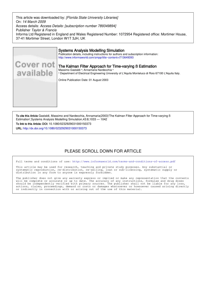 This article was downloaded by: [Florida State University Libraries] On: 14 March 2009 Access details: Access Details: [subscription number 789349894] Publisher Taylor & Francis Informa Ltd Registered in England and Wales Registered Number: 1072954 Registered office: Mortimer House, 37-41 Mortimer Street, London W1T 3JH, UK Systems Analysis Modelling Simulation Systems Analysis Modelling Simulation Publication details, including instructions for authors and subscription information: http://www.informaworld.com/smpp/title~content=t713649393 The Kalman Filter Approach for Time-varying ß Estimation The Kalman Filter Approach for Time-varying ß Estimation Massimo Gastaldi a ; Annamaria Nardecchia a a Department of Electrical Engineering University of L'Aquila Monteluco di Roio 67100 L'Aquila Italy. Online Publication Date: 01 August 2003 To cite this Article To cite this Article Gastaldi, Massimo and Nardecchia, Annamaria(2003)'The Kalman Filter Approach for Time-varying ß Estimation',Systems Analysis Modelling Simulation,43:8,1033 — 1042 To link to this Article: DOI: 10.1080/0232929031000150373 To link to this Article: DOI: URL: http://dx.doi.org/10.1080/0232929031000150373 URL: PLEASE SCROLL DOWN FOR ARTICLE Full terms and conditions of use: http://www.informaworld.com/terms-and-conditions-of-access.pdf This article may be used for research, teaching and private study purposes. Any substantial or systematic reproduction, re-distribution, re-selling, loan or sub-licensing, systematic supply or distribution in any form to anyone is expressly forbidden. The publisher does not give any warranty express or implied or make any representation that the contents will be complete or accurate or up to date. The accuracy of any instructions, formulae and drug doses should be independently verified with primary sources. The publisher shall not be liable for any loss, actions, claims, proceedings, demand or costs or damages whatsoever or howsoever caused arising directly or indirectly in connection with or arising out of the use of this material.