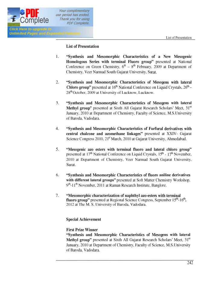 This article was downloaded by: [The Maharaja Sayajirao University of Baroda] On: 31 July 2012, At: 00:19 Publisher: Taylor & Francis Informa Ltd Registered in England and Wales Registered Number: 1072954 Registered office: Mortimer House, 37-41 Mortimer Street, London W1T 3JH, UK Molecular Crystals and Liquid Crystals Publication details, including instructions for authors and subscription information: http://www.tandfonline.com/loi/gmcl20 Synthesis and Mesomorphic Characteristics of Fluoroaniline Derivatives with Different Lateral Groups Jayrang S. Dave a , Purvang D. Patel a & Himanshu Bhatt a a Department of Applied Chemistry, Faculty of Technology and Engineering, The M.S. University of Baroda, Vadodara, India Version of record first published: 30 Jul 2012 To cite this article: Jayrang S. Dave, Purvang D. Patel & Himanshu Bhatt (2012): Synthesis and Mesomorphic Characteristics of Fluoroaniline Derivatives with Different Lateral Groups, Molecular Crystals and Liquid Crystals, 562:1, 76-84 To link to this article: http://dx.doi.org/10.1080/10426507.2012.669678 PLEASE SCROLL DOWN FOR ARTICLE Full terms and conditions of use: http://www.tandfonline.com/page/terms-and-conditions This article may be used for research, teaching, and private study purposes. Any substantial or systematic reproduction, redistribution, reselling, loan, sub-licensing, systematic supply, or distribution in any form to anyone is expressly forbidden. The publisher does not give any warranty express or implied or make any representation that the contents will be complete or accurate or up to date. The accuracy of any instructions, formulae, and drug doses should be independently verified with primary sources. The publisher shall not be liable for any loss, actions, claims, proceedings, demand, or costs or damages whatsoever or howsoever caused arising directly or indirectly in connection with or arising out of the use of this material.