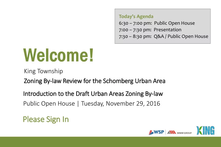 Today’s Agenda 6:30 – 7:00 pm: Public Open House 7:00 – 7:30 pm: Presentation 7:30 – 8:30 pm: Q&A / Public Open House King Township Zoning By By-law Review for the Schomberg Urban Area In Introduction to the Draft Urban Areas Zoning By-law Public Open House | Tuesday, November 29, 2016 Please Sign In In