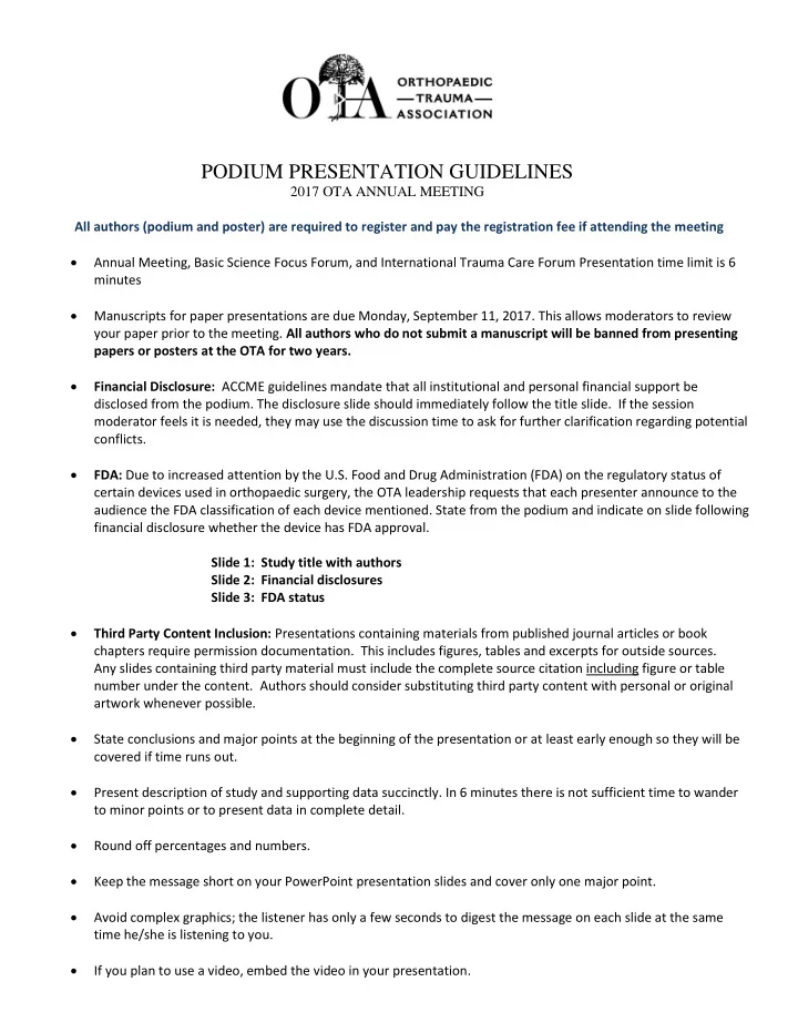 PODIUM PRESENTATION GUIDELINES 2017 OTA ANNUAL MEETING All authors (podium and poster) are required to register and pay the registration fee if attending the meeting Annual Meeting, Basic Science Focus Forum, and International Trauma Care Forum Presentation time limit is 6 minutes Manuscripts for paper presentations are due Monday, September 11, 2017. This allows moderators to review your paper prior to the meeting. All authors who do not submit a manuscript will be banned from presenting papers or posters at the OTA for two years. Financial Disclosure: ACCME guidelines mandate that all institutional and personal financial support be disclosed from the podium. The disclosure slide should immediately follow the title slide. If the session moderator feels it is needed, they may use the discussion time to ask for further clarification regarding potential conflicts. FDA: Due to increased attention by the U.S. Food and Drug Administration (FDA) on the regulatory status of certain devices used in orthopaedic surgery, the OTA leadership requests that each presenter announce to the audience the FDA classification of each device mentioned. State from the podium and indicate on slide following financial disclosure whether the device has FDA approval. Slide 1: Study title with authors Slide 2: Financial disclosures Slide 3: FDA status Third Party Content Inclusion: Presentations containing materials from published journal articles or book chapters require permission documentation. This includes figures, tables and excerpts for outside sources. Any slides containing third party material must include the complete source citation including figure or table number under the content. Authors should consider substituting third party content with personal or original artwork whenever possible. State conclusions and major points at the beginning of the presentation or at least early enough so they will be covered if time runs out. Present description of study and supporting data succinctly. In 6 minutes there is not sufficient time to wander to minor points or to present data in complete detail. Round off percentages and numbers. Keep the message short on your PowerPoint presentation slides and cover only one major point. Avoid complex graphics; the listener has only a few seconds to digest the message on each slide at the same time he/she is listening to you. If you plan to use a video, embed the video in your presentation.