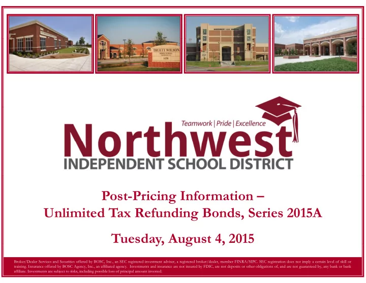 Post-Pricing Information – Unlimited Tax Refunding Bonds, Series 2015A U li i d T R f di B d S i 2015A Tuesday, August 4, 2015 y, g , Broker/Dealer Services and Securities offered by BOSC, Inc., an SEC registered investment adviser, a registered broker/dealer, member FINRA/SIPC. SEC registration does not imply a certain level of skill or training. Insurance offered by BOSC Agency, Inc., an affiliated agency. Investments and insurance are not insured by FDIC, are not deposits or other obligations of, and are not guaranteed by, any bank or bank affiliate. Investments are subject to risks, including possible loss of principal amount invested.