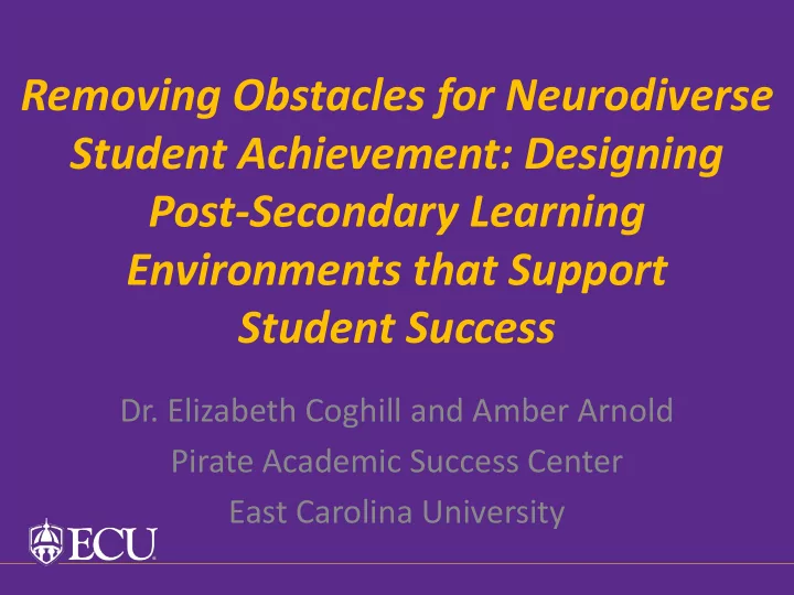 Removing Obstacles for Neurodiverse Student Achievement: Designing Post-Secondary Learning Environments that Support Student Success Dr. Elizabeth Coghill and Amber Arnold Pirate Academic Success Center East Carolina University
