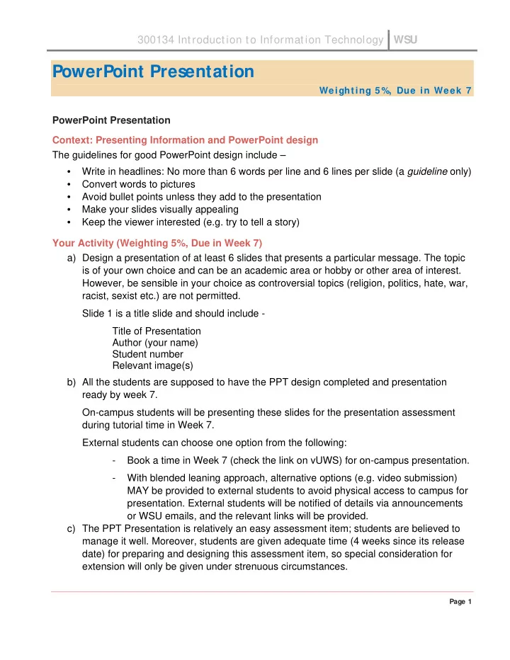 300134 Introduction to Information Technology WSU PowerPoint Presentation Weight ing 5%, Due in Week 7 PowerPoint Presentation Context: Presenting Information and PowerPoint design The guidelines for good PowerPoint design include – • Write in headlines: No more than 6 words per line and 6 lines per slide (a guideline only) • Convert words to pictures • Avoid bullet points unless they add to the presentation • Make your slides visually appealing • Keep the viewer interested (e.g. try to tell a story) Your Activity (Weighting 5%, Due in Week 7) a) Design a presentation of at least 6 slides that presents a particular message. The topic is of your own choice and can be an academic area or hobby or other area of interest. However, be sensible in your choice as controversial topics (religion, politics, hate, war, racist, sexist etc.) are not permitted. Slide 1 is a title slide and should include - Title of Presentation Author (your name) Student number Relevant image(s) b) All the students are supposed to have the PPT design completed and presentation ready by week 7. On-campus students will be presenting these slides for the presentation assessment during tutorial time in Week 7. External students can choose one option from the following: - Book a time in Week 7 (check the link on vUWS) for on-campus presentation. - With blended leaning approach, alternative options (e.g. video submission) MAY be provided to external students to avoid physical access to campus for presentation. External students will be notified of details via announcements or WSU emails, and the relevant links will be provided. c) The PPT Presentation is relatively an easy assessment item; students are believed to manage it well. Moreover, students are given adequate time (4 weeks since its release date) for preparing and designing this assessment item, so special consideration for extension will only be given under strenuous circumstances. Page 1