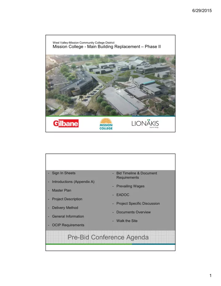 6/29/2015 West Valley-Mission Community College District Mission College - Main Building Replacement – Phase II - Sign In Sheets - Bid Timeline & Document Requirements - Introductions (Appendix A) - Prevailing Wages - Master Plan - EADOC - Project Description - Project Specific Discussion - Delivery Method - Documents Overview - General Information - Walk the Site - OCIP Requirements Pre-Bid Conference Agenda 1