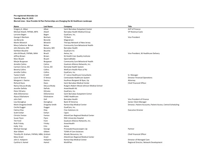 Pre-registered Attendee List Tuesday, May 19, 2015 Blurred Lines: How Provider & Plan Partnerships are Changing the NJ Healthcare Landscape Name Last Name Company Title Gregory A. Alban Alban Saint Barnabas Outpatient Center AVP of Finance Michael Alwell, FHFMA, MPA Alwell Barnabas Health Medical Group VP Revenue Cycle Lorraine Bagen Bagen QualCare, Inc. George H Benham Benham TD Bank Vice President Joe Berardo Berardo MagnaCare Martin Bilowich Bilowich Therapy Network of New Jersey Mary-Catherine Bohan Bohan Community Care Behavioral Health John Bonamo, MD Bonamo, MD Barnabas Health Kathleen Boushie Boushie QualCare Inc John M Brault, FHFMA, MHA Brault Aetna, Inc. Vice President, NJ Healthcare Delivery Jeffrey Brown Brown NJ Health Care Quality Institute Marc Bryant Bryant SpectraMedix Marjie Burgasser Burgasser Community Care Behavioral Health Annette Catino Catino Qualcare Alliance Networks, Inc. Carmen Ciervo, DO Ciervo, DO Kennedy Health System Beverly Collins Collins WellCare Health Plans of NJ Jennifer Collins Collins QualCare, Inc. Tamie Critelli Critelli O``conco Healthcare Consultants Sr. Manager Laura D`Amico D`Amico Centrastate Healthcare System Director Financial Operations Margaret J. Davino Davino Kaufman Borgeest & Ryan, Llp Attorney Richard Davis Davis Saint Barnabas Medical Center Chief Financial Officer Nancy DeLuca-Brady DeLuca-Brady Rutgers-Robert Wood Johnson Medical School Jennifer DePola DePola AmeriHealth NJ Peter DiCanto DiCanto QualCare, Inc. Aldo DiDomenico DiDomenico Saint Barnabas Outpatient Center Alyssa DiSalvatore DiSalvatore VARO Healthcare John Doll Doll Barnabas Health Vice President of Finance Lisa Donoghue Donoghue Bank Of America Senior Client Manager Marie Dragotta-Smith Dragotta-Smith Raritan Bay Medical Center Director, Patient Accounts, Patient Access, Central Scheduling Cecilia Dugger Dugger QualCare, Inc. Fatima Elias Elias Fme Solutions Llc Executive Director Scott Evelyn Evelyn Cigna Christin Fenton Fenton AtlantiCare Regional Medical Center Susan Flynn Flynn RWJ University Hospital Tim Ford Ford Qualcare Alliance Networks, Inc. Ruth Fritsky Fritsky AmeriHealth Holly Fritz Fritz Aetna Michael George George Pricewaterhousecoopers Llp Partner Alan Gilbert Gilbert TEAM of Care Solutions Timothy M. Graham, FHFMA, MBA, C Graham Woods Resources, Inc. Chief Financial Officer Mary Grant Grant AtlantiCare Regional Medical Center John S. Hailperin Hailperin Raritan Bay Medical Center Director of Managed Care Cynthia A. Hamel Hamel MultiPlan Regional Director, Network Development