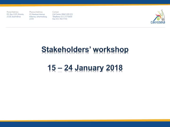 Workshop outcome • CATHSSETA will produce a comprehensive consolidated skills report that will indicate some of the following key results: – Identification of key groups of SMMEs, NGOs, NPOs , Trade Unions, their sectors and skills shortages; – Regional plans for small businesses which CATHSSETA could support through skills interventions