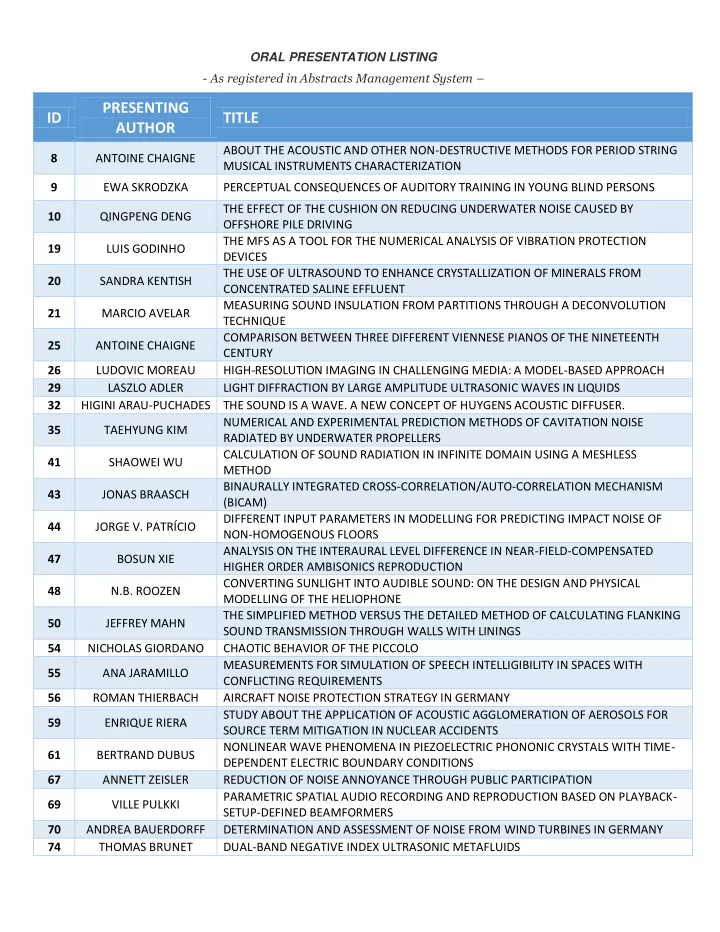 ORAL PRESENTATION LISTING - As registered in Abstracts Management System – PRESENTING ID TITLE AUTHOR ABOUT THE ACOUSTIC AND OTHER NON-DESTRUCTIVE METHODS FOR PERIOD STRING 8 ANTOINE CHAIGNE MUSICAL INSTRUMENTS CHARACTERIZATION 9 EWA SKRODZKA PERCEPTUAL CONSEQUENCES OF AUDITORY TRAINING IN YOUNG BLIND PERSONS THE EFFECT OF THE CUSHION ON REDUCING UNDERWATER NOISE CAUSED BY 10 QINGPENG DENG OFFSHORE PILE DRIVING THE MFS AS A TOOL FOR THE NUMERICAL ANALYSIS OF VIBRATION PROTECTION 19 LUIS GODINHO DEVICES THE USE OF ULTRASOUND TO ENHANCE CRYSTALLIZATION OF MINERALS FROM 20 SANDRA KENTISH CONCENTRATED SALINE EFFLUENT MEASURING SOUND INSULATION FROM PARTITIONS THROUGH A DECONVOLUTION 21 MARCIO AVELAR TECHNIQUE COMPARISON BETWEEN THREE DIFFERENT VIENNESE PIANOS OF THE NINETEENTH 25 ANTOINE CHAIGNE CENTURY 26 LUDOVIC MOREAU HIGH-RESOLUTION IMAGING IN CHALLENGING MEDIA: A MODEL-BASED APPROACH 29 LASZLO ADLER LIGHT DIFFRACTION BY LARGE AMPLITUDE ULTRASONIC WAVES IN LIQUIDS 32 HIGINI ARAU-PUCHADES THE SOUND IS A WAVE. A NEW CONCEPT OF HUYGENS ACOUSTIC DIFFUSER. NUMERICAL AND EXPERIMENTAL PREDICTION METHODS OF CAVITATION NOISE 35 TAEHYUNG KIM RADIATED BY UNDERWATER PROPELLERS CALCULATION OF SOUND RADIATION IN INFINITE DOMAIN USING A MESHLESS 41 SHAOWEI WU METHOD BINAURALLY INTEGRATED CROSS-CORRELATION/AUTO-CORRELATION MECHANISM 43 JONAS BRAASCH (BICAM) DIFFERENT INPUT PARAMETERS IN MODELLING FOR PREDICTING IMPACT NOISE OF 44 JORGE V. PATRÍCIO NON-HOMOGENOUS FLOORS ANALYSIS ON THE INTERAURAL LEVEL DIFFERENCE IN NEAR-FIELD-COMPENSATED 47 BOSUN XIE HIGHER ORDER AMBISONICS REPRODUCTION CONVERTING SUNLIGHT INTO AUDIBLE SOUND: ON THE DESIGN AND PHYSICAL 48 N.B. ROOZEN MODELLING OF THE HELIOPHONE THE SIMPLIFIED METHOD VERSUS THE DETAILED METHOD OF CALCULATING FLANKING 50 JEFFREY MAHN SOUND TRANSMISSION THROUGH WALLS WITH LININGS 54 NICHOLAS GIORDANO CHAOTIC BEHAVIOR OF THE PICCOLO MEASUREMENTS FOR SIMULATION OF SPEECH INTELLIGIBILITY IN SPACES WITH 55 ANA JARAMILLO CONFLICTING REQUIREMENTS 56 ROMAN THIERBACH AIRCRAFT NOISE PROTECTION STRATEGY IN GERMANY STUDY ABOUT THE APPLICATION OF ACOUSTIC AGGLOMERATION OF AEROSOLS FOR 59 ENRIQUE RIERA SOURCE TERM MITIGATION IN NUCLEAR ACCIDENTS NONLINEAR WAVE PHENOMENA IN PIEZOELECTRIC PHONONIC CRYSTALS WITH TIME- 61 BERTRAND DUBUS DEPENDENT ELECTRIC BOUNDARY CONDITIONS 67 ANNETT ZEISLER REDUCTION OF NOISE ANNOYANCE THROUGH PUBLIC PARTICIPATION PARAMETRIC SPATIAL AUDIO RECORDING AND REPRODUCTION BASED ON PLAYBACK- 69 VILLE PULKKI SETUP-DEFINED BEAMFORMERS 70 ANDREA BAUERDORFF DETERMINATION AND ASSESSMENT OF NOISE FROM WIND TURBINES IN GERMANY 74 THOMAS BRUNET DUAL-BAND NEGATIVE INDEX ULTRASONIC METAFLUIDS