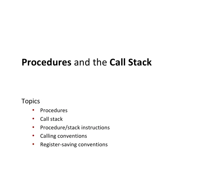 Procedures and the Call Stack Topics • Procedures • Call stack • Procedure/stack instructions • Calling conventions • Register-saving conventions