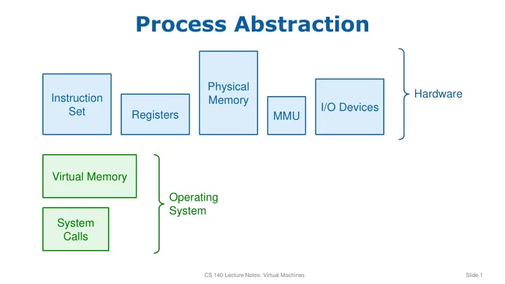 Process Abstraction Physical Hardware Instruction Memory I/O Devices Set Registers MMU Virtual Memory Operating System System Calls CS 140 Lecture Notes: Virtual Machines Slide 1