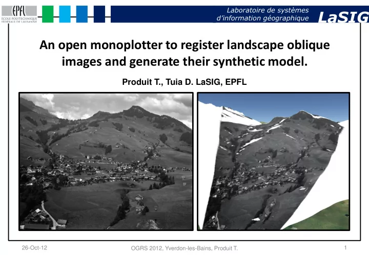 Laboratoire de systèmes d’information géographique LaSIG An open monoplotter to register landscape oblique images and generate their synthetic model. Produit T., Tuia D. LaSIG, EPFL 26-Oct-12 1 OGRS 2012, Yverdon-les-Bains, Produit T.
