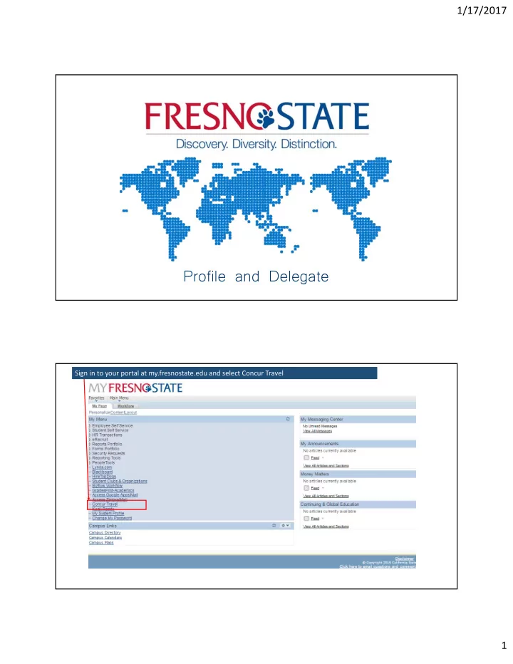 1/17/2017 Profile and Delegate Sign in to your portal at my.fresnostate.edu and select Concur Travel 1