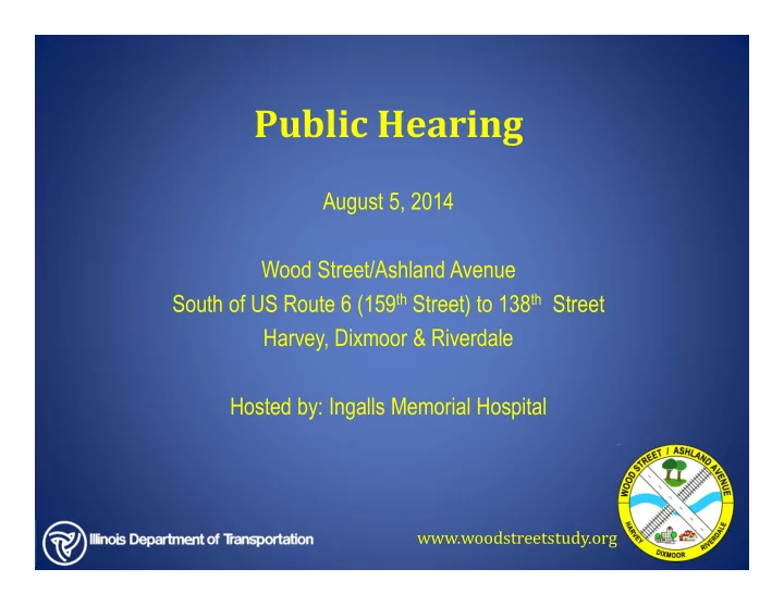 Public Hearing August 5, 2014 Wood Street/Ashland Avenue South of US Route 6 (159 th Street) to 138 th Street Harvey, Dixmoor & Riverdale Hosted by: Ingalls Memorial Hospital www.woodstreetstudy.org