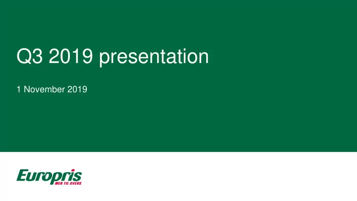 Disclaimer This presentation has been produced by Europris ASA (the "Company") exclusively for information purposes. This Presentation has not been approved, reviewed or registered with any public authority or stock exchange. Further to the aforementioned, this presentation is the result of an effort of the Company to present certain information which the Company has deemed relevant in accessible format. This Presentation is not intended to contain an exhaustive overview of the Company's present or future financial condition and there are several other facts and circumstances relevant to the Company and its present and future financial condition that not been included in this Presentation. This Presentation may not be disclosed, in whole or in part, or summarized or otherwise reproduced, distributed or referred to, in whole or in part, without prior written consent of the Company. This Presentation contains certain forward-looking statements relating to the business, financial performance and results of the Company and/or the industry in which it operates or intends to operate. Forward-looking statements concern future circumstances and results and other statements that are not historical facts, sometimes identified by the words "believes", expects", "predicts", "intends", "projects", "plans", "estimates", "aims", "foresees", "anticipates", "targets", and similar expressions. The forward-looking statements contained in this Presentation, including assumptions, opinions and views of the Company or cited from third party sources are solely opinions and forecasts which are subject to risks, uncertainties and other factors that may cause actual events to differ materially from any anticipated development. None of the Company or any of its subsidiary undertakings or any such person's officers or employees provides any assurance that the assumptions underlying such forward-looking statements are free from errors nor does any of them accept any responsibility for the future accuracy of the opinions expressed in this Presentation or the actual occurrence of the forecasted developments. The Company assumes no obligation to update any forward-looking statements or to conform these forward-looking statements to our actual results. Furthermore, information about past performance given in this Presentation is given for illustrative purposes only and should not be relied upon as, and is not, an indication of future performance. No representation or warranty (express or implied) is made as to, and no reliance should be placed on, any information, including projections, estimates, targets and opinions, contained herein, and no liability whatsoever is accepted as to any errors, omissions or misstatements contained herein, and, accordingly, neither the Company nor any of its parent or subsidiary undertakings or any such person’s officers or employees accepts any liability whatsoever arising directly or indirectly from the use of this document. By reviewing this Presentation you acknowledge that you will be solely responsible for your own assessment of the market and the market position of the Company and that you will conduct your own analysis and be solely responsible for forming your own view of the potential future performance of the businesses of the Company. This Presentation must be read in conjunction with the recent financial reports of the Company and the disclosures therein. The distribution of this Presentation in certain jurisdictions may be restricted by law. Persons in possession of this Presentation are required to inform themselves about, and to observe, any such restrictions. No action has been taken or will be taken in any jurisdiction by the Company that would permit the possession or distribution of this Presentation in any country or jurisdiction where specific action for that purpose is required. No shares or other securities are being offered pursuant to this Presentation. This Presentation does not constitute an offer to sell or form part of, and should not be construed as, an offer or invitation for the sale or subscription of, or a solicitation of an offer to buy or subscribe for, any shares or other securities in any jurisdiction, nor shall it or any part of it or the fact of its distribution form the basis of, or be relied on in connection with, any offer, contract, commitment or investment decision relating thereto, nor does it constitute a recommendation regarding the securities of the Company. By reviewing this Presentation you agree to be bound by the foregoing limitations. This Presentation speaks as of 5 December 2018. Neither the delivery of this Presentation nor any further discussions of the Company with any of the recipients shall, under any circumstances, create any implication that there has been no change in the affairs of the Company since such date. The Company does not intend, and does not assume any obligation, to update or correct any information included in this Presentation. This Presentation shall be governed by Norwegian law, and any disputes relating to hereto is subject to the sole and exclusive jurisdiction of Norwegian courts. 2