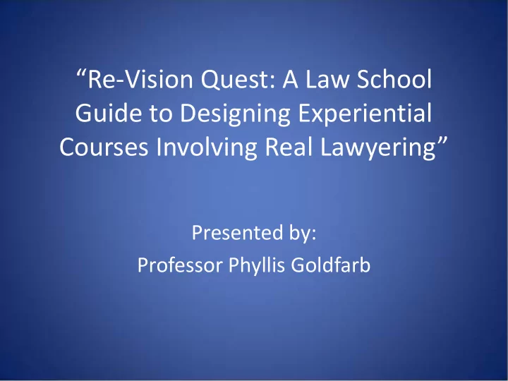 “Re-Vision Quest: A Law School Guide to Designing Experiential Courses Involving Real Lawyering” Presented by: Professor Phyllis Goldfarb