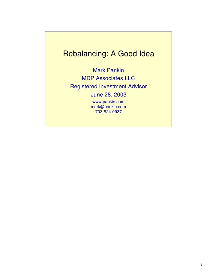 Rebalancing: A Good Idea Mark Pankin MDP Associates LLC Registered Investment Advisor June 28, 2003 www.pankin.com mark@pankin.com 703-524-0937 1